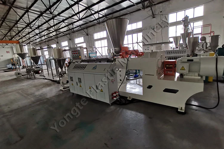 2024 मध्ये, आम्ही पोलिश क्लायंटसाठी सानुकूल PVC कंपाऊंड पेलेटायझिंग मशीन इंजिनियर केले, विशेषत: पुनर्नवीनीकरण केलेल्या PVC आणि CaCO₃ फिलरपासून PVC मास्टरबॅच ग्रॅन्युल तयार करण्यासाठी डिझाइन केलेले. CaCO₃ फिलर सामग्री ग्राहकाच्या उत्पादन वैशिष्ट्यांसह संरेखित करण्यासाठी 40% आणि 80% दरम्यान लवचिकपणे समायोजित केली जाऊ शकते. मुख्य घटकांमध्ये स्वयंचलित फीडर, एक SJSZ80/156 शंकूच्या आकाराचे ट्विन-स्क्रू एक्स्ट्रूडर (ABB फ्रिक्वेंसी इन्व्हर्टरसह 75kW मोटर, स्थिर ऑपरेशन दरम्यान ~50KW वापरते), एकसमान ग्रॅन्युल कटिंगसाठी हॉट पेलेटिझिंग डाय, आणि 304 स्टेनलेस स्टील रॅपिड कूलिंग सिस्टम आणि 304 स्टेनलेस स्टील कूलिंग सिस्टम. मशीन 300-400 kg/तास उत्पादन क्षमता प्राप्त करते आणि शून्य डाउनटाइमसह 24/7 सतत ऑपरेशनसाठी तयार केली जाते. स्थापना अखंड होती, यॉन्गटेच्या तज्ञ टीमने समर्थित केले, ज्याने एंड-टू-एंड सहाय्य प्रदान केले. स्थापनेनंतर, साइटवरील प्रशिक्षणाने क्लायंटच्या कर्मचाऱ्यांना उपकरणे कुशलतेने ऑपरेट करण्यासाठी सक्षम केले, तर व्हिडिओ मार्गदर्शनाद्वारे दूरस्थ तांत्रिक सहाय्याने कोणत्याही समस्यांचे त्वरित निराकरण सुनिश्चित केले, निर्बाध उत्पादन आणि उत्कृष्ट कामगिरी राखली.
